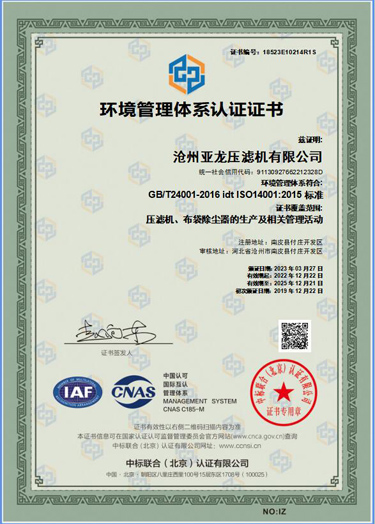 環(huán)境管理體系認(rèn)證證書-滄州亞龍壓濾機(jī)有限公司