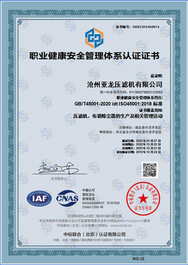 職業(yè)健康安全管理體系認(rèn)證證書-滄州亞龍壓濾機(jī)有限公司