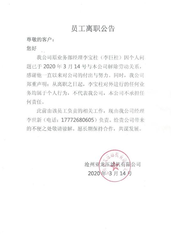 業務部經理離職聲明-滄州亞龍壓濾機有限公司